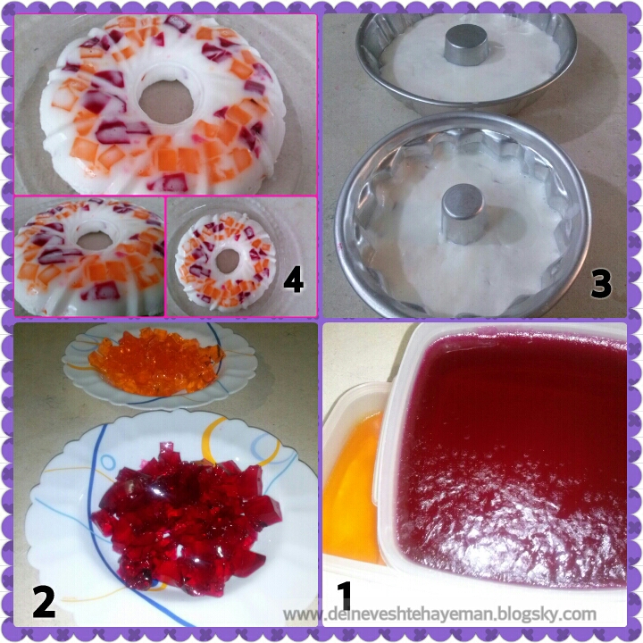 دیگه اون یه قالب رو صبر کردم و امروز رفتم سروقتش و خیلی با حوصله برش گرداندم البته دیشب رفتم توی سایت و قسمت « فوت و فن جداکردن ژله از ظرف » خوندم و خداییش یه نکاتی گفته بود که خیلی به دردم خورد.از تمام مراحل براتون عکس گرفتم .